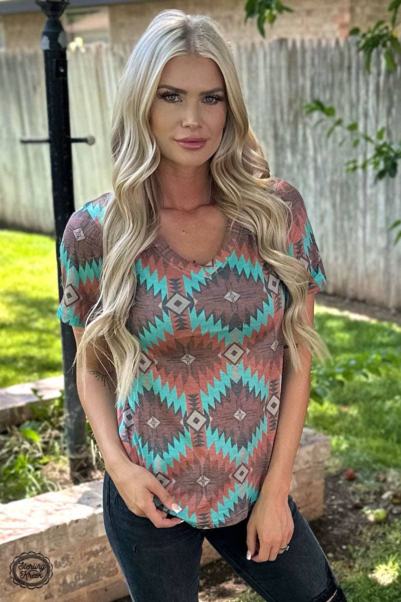 This Gettin' Western Top is just the thing to show off your playful style! Its turquoise and brown aztec pattern gives you a unique look that makes you stand out in the crowd. Do some two-steppin' in this v-neck and get ready for the perfect western adventure! Yee-haw!