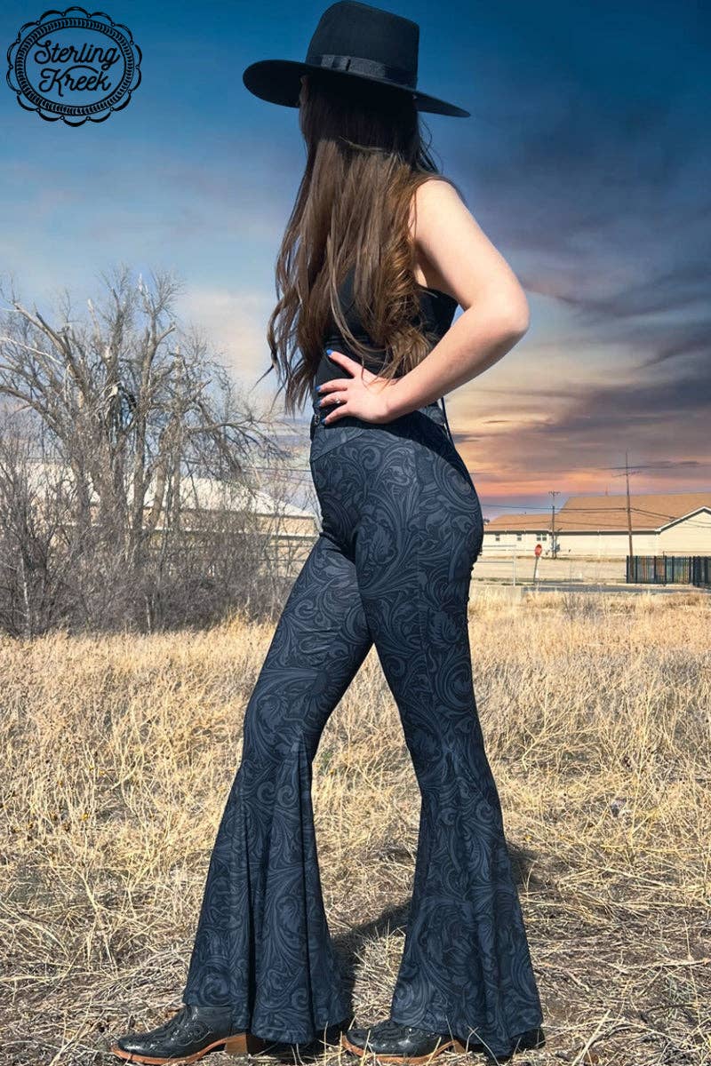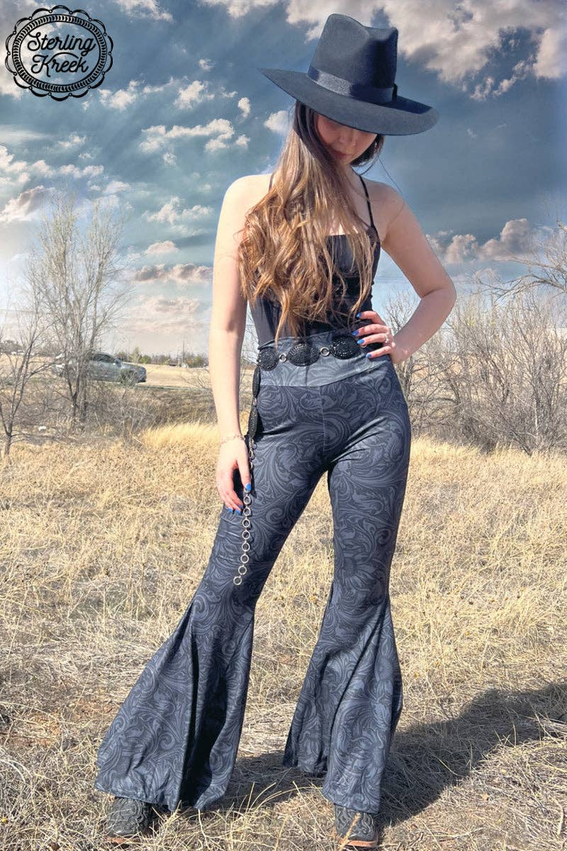 Grey days no more - liven up any ensemble with these fun and funky black tooled leather bell bottoms! With an on-trend fit and a classic design, you'll be ringing in many more fashionable moments. Wow the crowd with these bells!