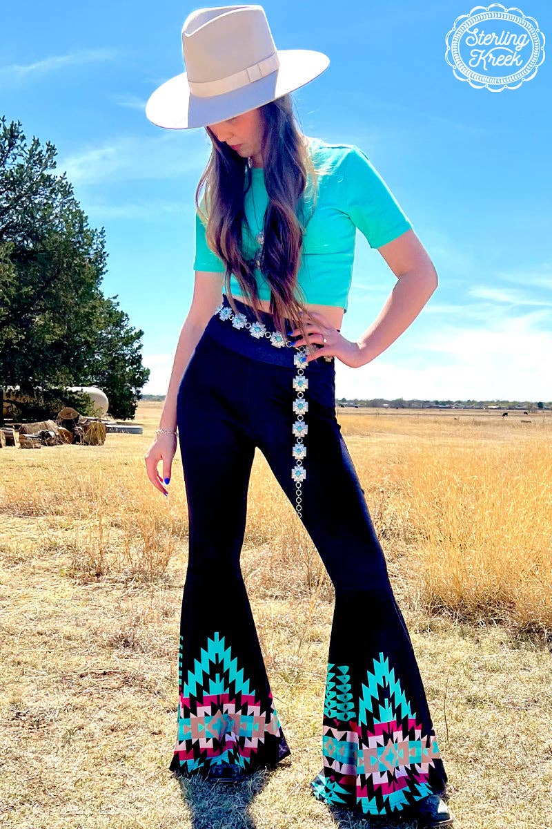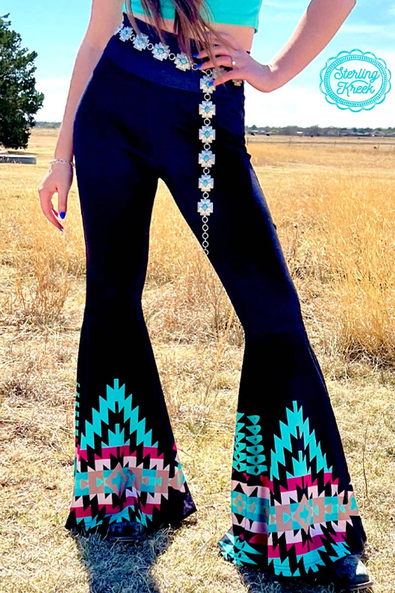 Make a statement with these NEW HOME TOWN BELLS! These solid black bell bottoms add the perfect touch of edginess to your outfit, complete with an aztec-inspired printed bottom that won't go unnoticed. Add a little boom to your style!