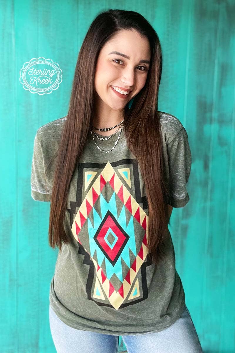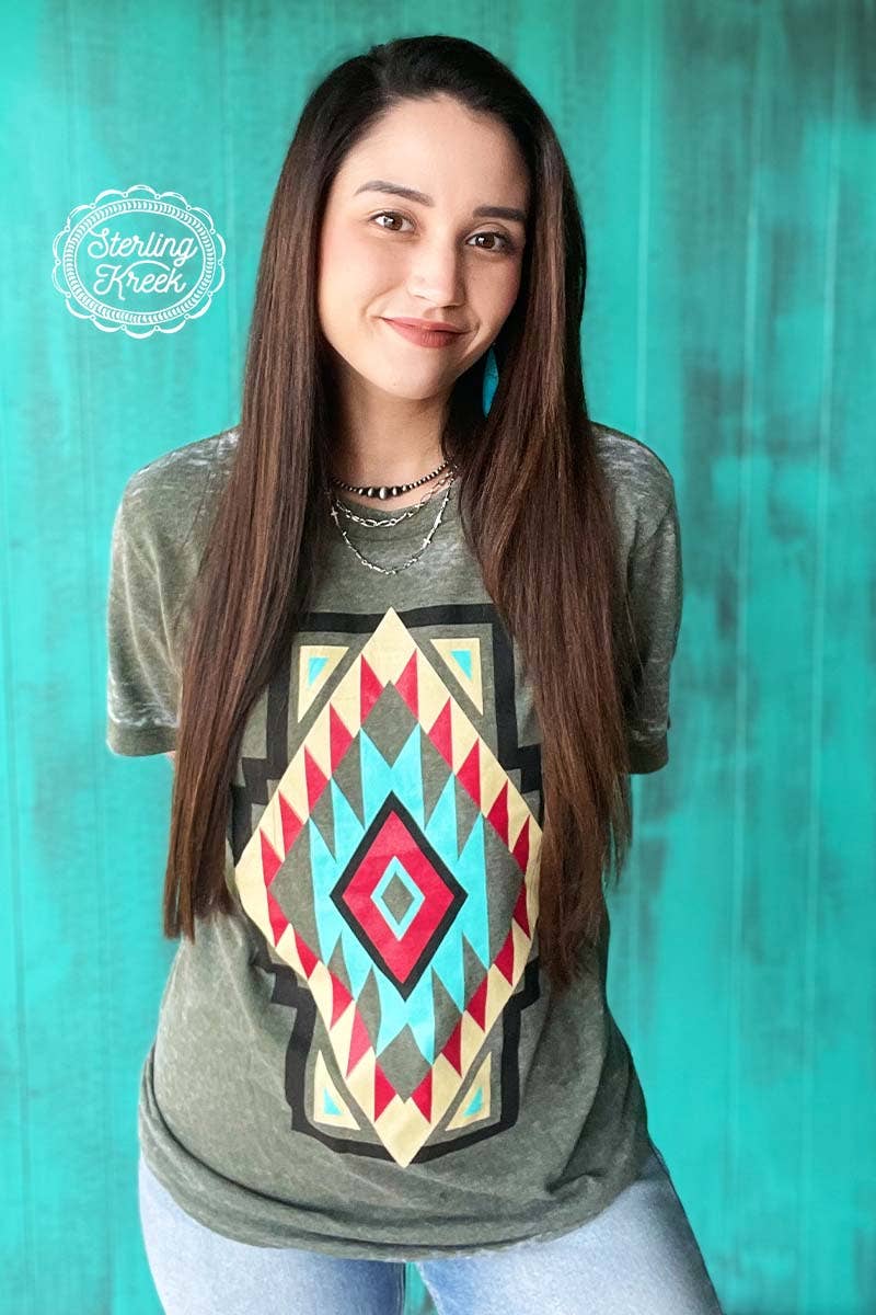This shirt is to die for! This features an Aztec design on an olive green mineral wash base. This top is so soft and comfortable and runs true to size!