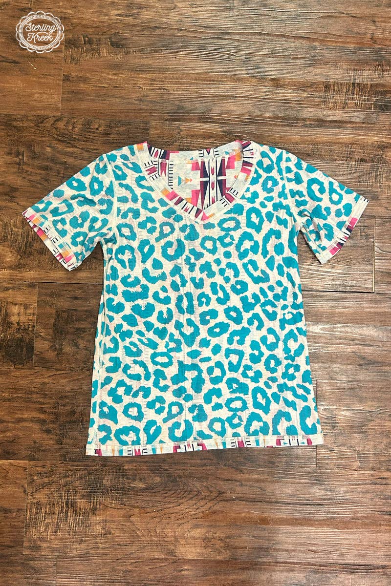 This top is the wild party animal you'll always be down for - double the fun with it's reversible v-neck, featuring a fierce turquoise leopard one side and a colorful aztec pattern on the other! We Go Together - like mac & cheese! 🧀